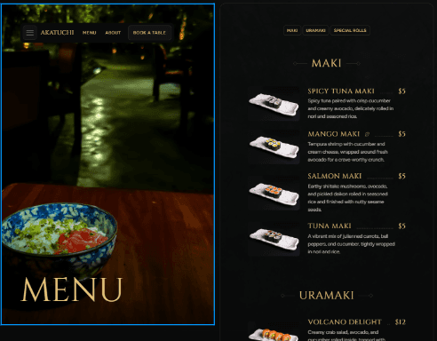 The project started with research into Akatuchi’s brand, cuisine, and target clientele. The focus was on translating a premium, in-restaurant experience into a digital format that felt sophisticated and immersive..